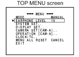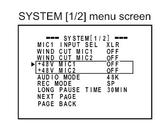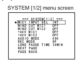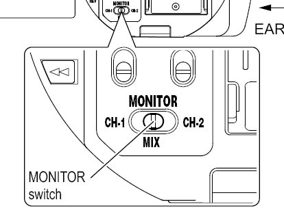 Coloque agora o fone do ouvido na tomada (34). Pelo menu TOP MENU, selecione um volume de fones confortável. Pelo interruptor (24) você pode selecionar o microfone que quer monitorar: ou o embutido, MIC 1, ou o outro, MIC 2. Ou os dois, em mix. Escolha MIC 2. |